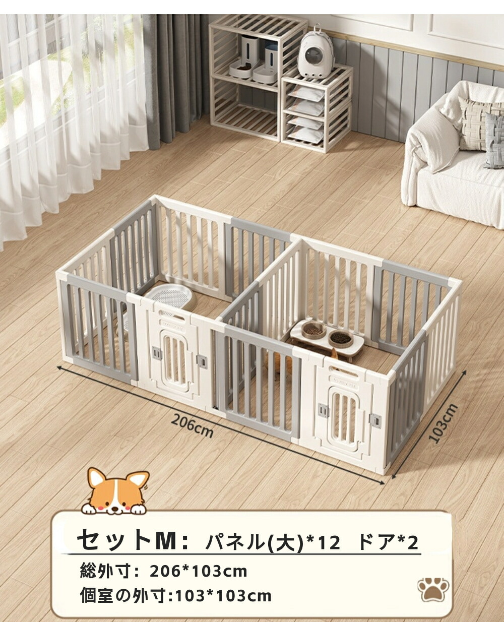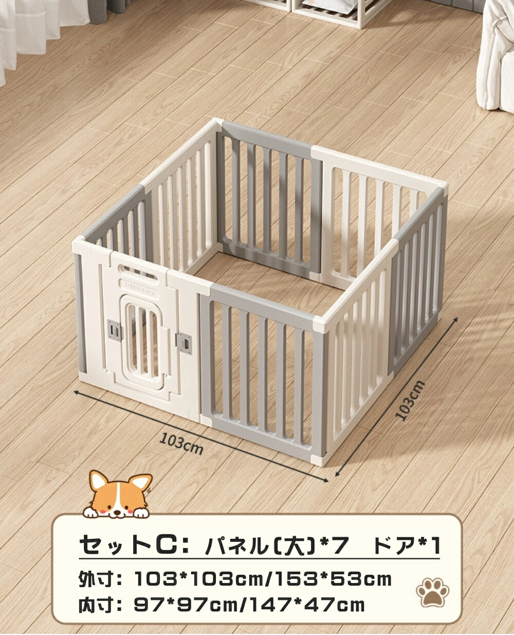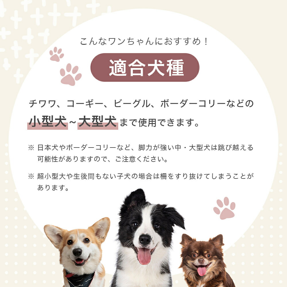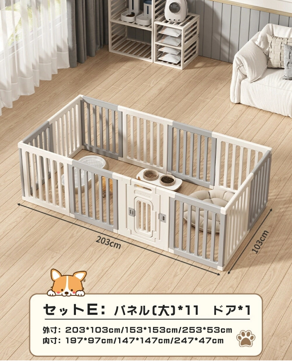 ・自由に組み合わせ可能なパネルは、小型犬から中型犬までのサイズに対応し、ペットの成長や活動量に合わせて最適な空間を作ることができます。