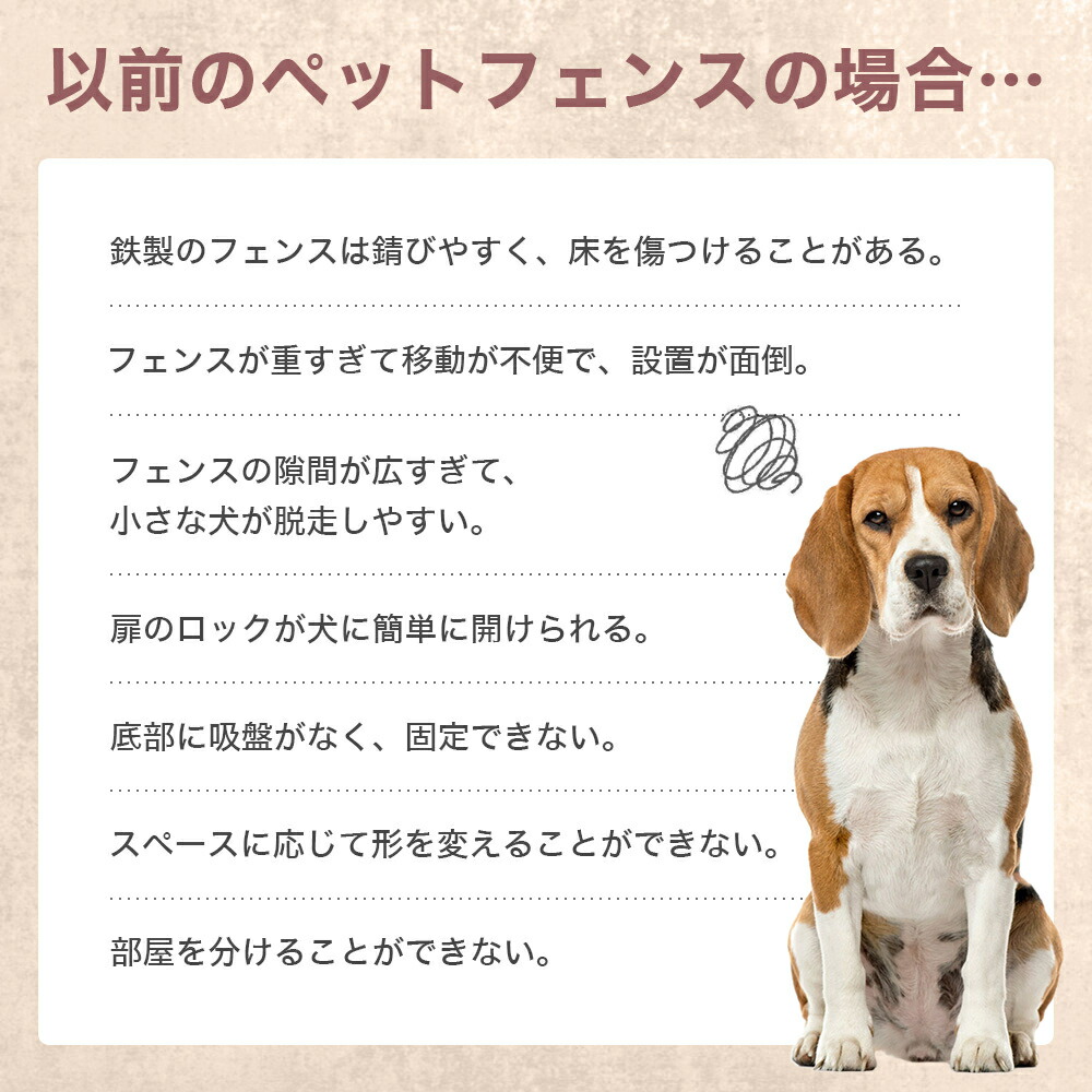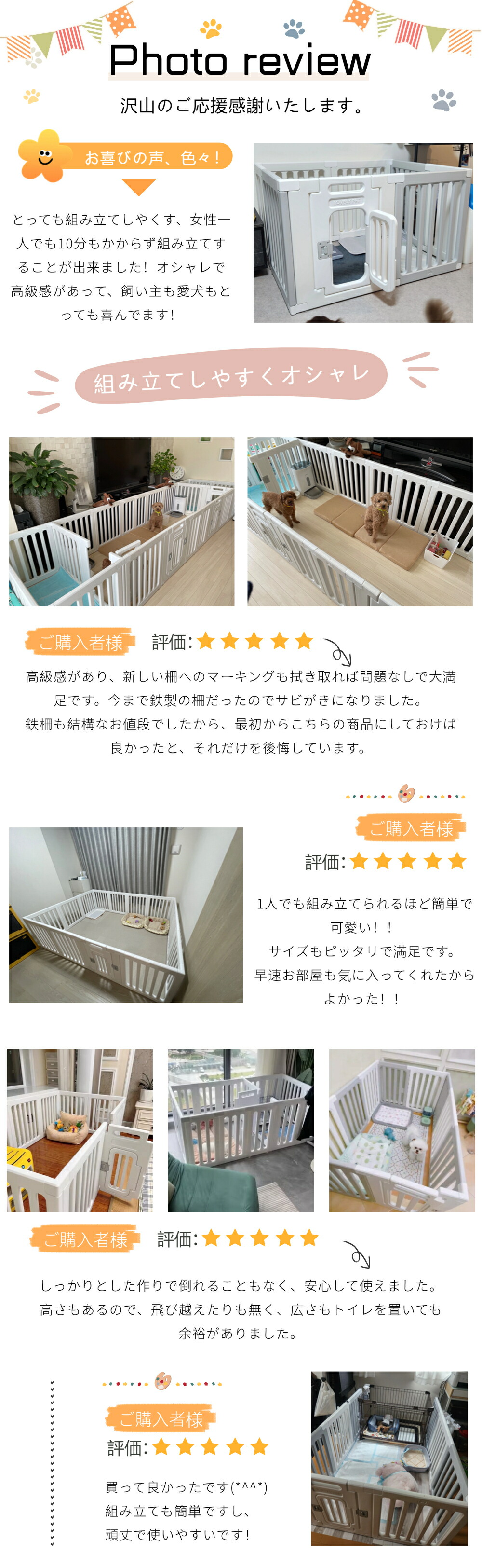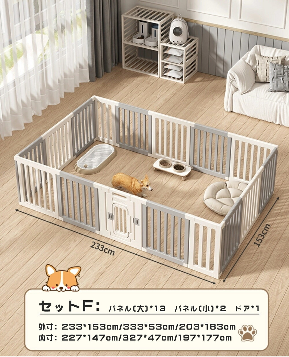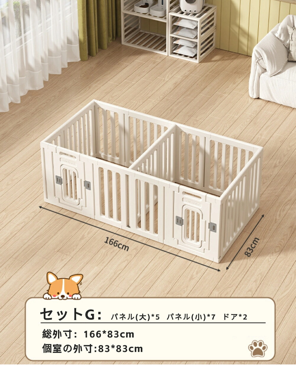 ・自由に組み合わせ可能なパネルは、小型犬から中型犬までのサイズに対応し、ペットの成長や活動量に合わせて最適な空間を作ることができます。