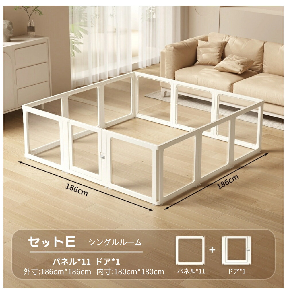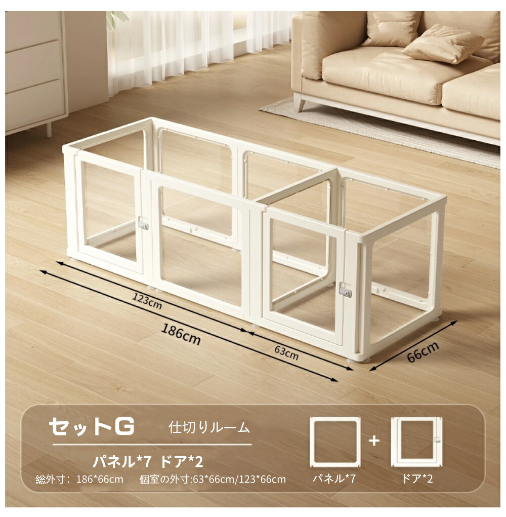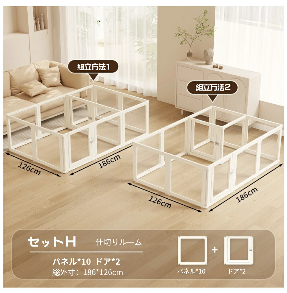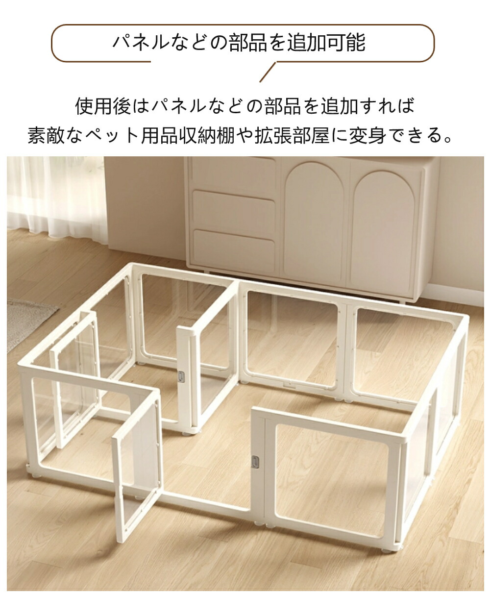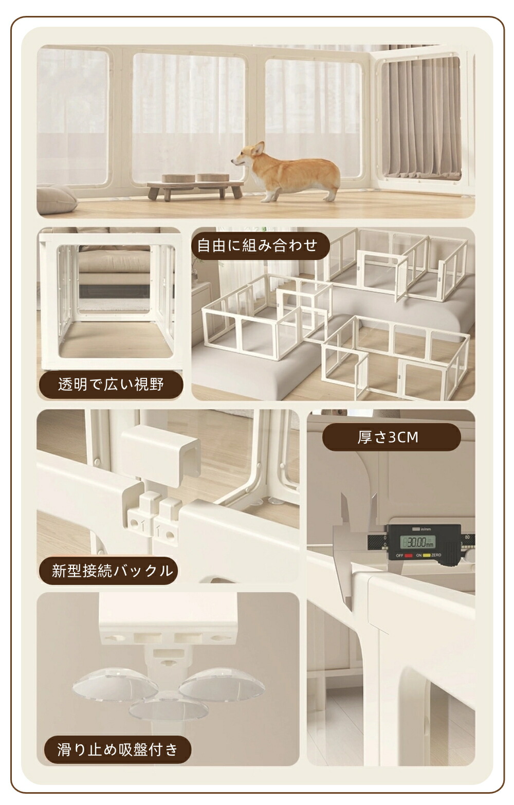 ・自由に組み合わせ可能なパネルは、小型犬から中型犬までのサイズに対応し、ペットの成長や活動量に合わせて最適な空間を作ることができます。