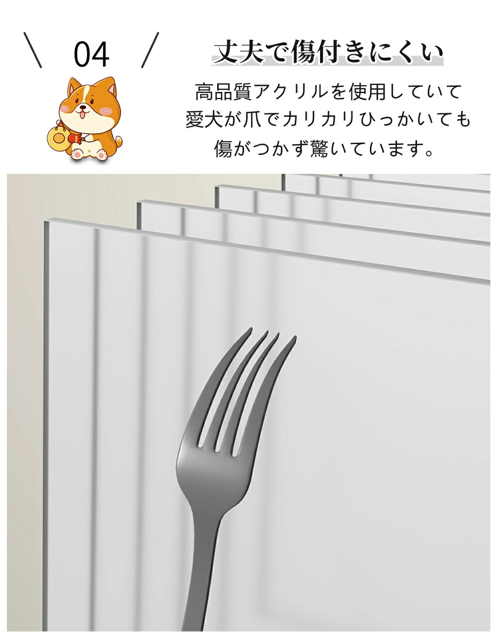 ・高密度HDPEと高品質アクリルを使用していて、愛犬が爪でカリカリひっかいても傷がつかず驚いています。