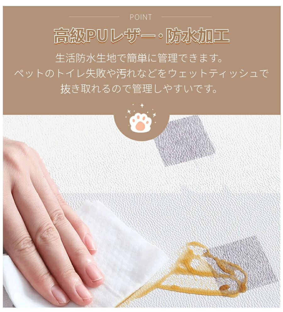 ・PUレザーを使用し、防水性と速乾性を兼ね備えているため、ペットのトイレシートとしても最適です。