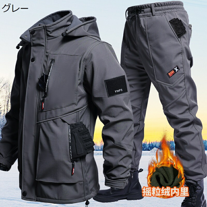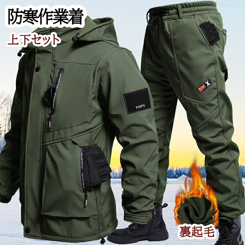 メンズ 冬用作業着セット 裏起毛 防風ジャケット 作業パンツ 長袖 フード付き 防水 防風 厚手 アウトドア バイク スキーなど適用 プラスサイズ 釣り