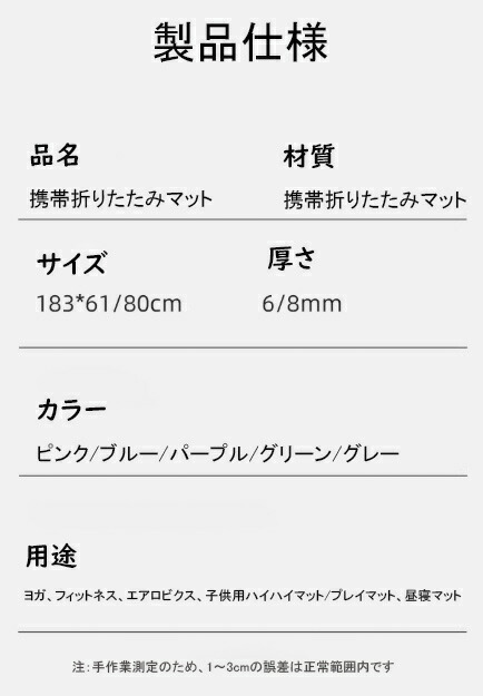 折りたたみ式ヨガマット - 厚さ 6m スポーツ アウトドア 続々登場 ピンク ブルー パープル グリーン グレー 183*61*6mm 183*61*8mm 183*80*6mm 183*80*8mm