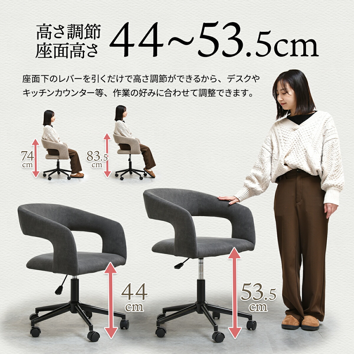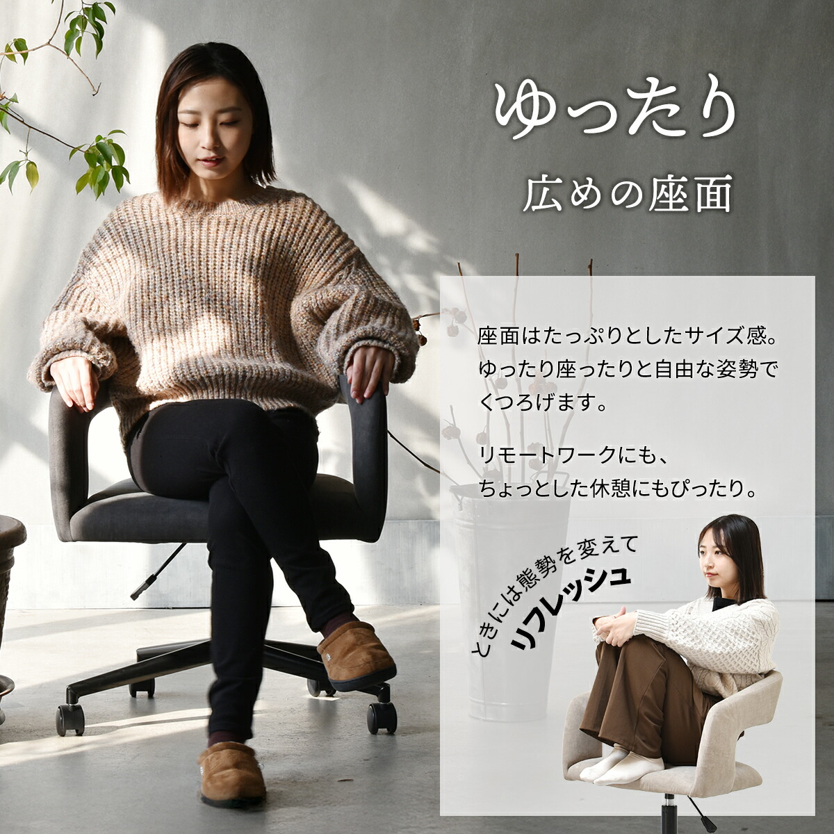 ふんわり座れる広い座面と高さ調節機能で、長時間のPC作業も快適に。
