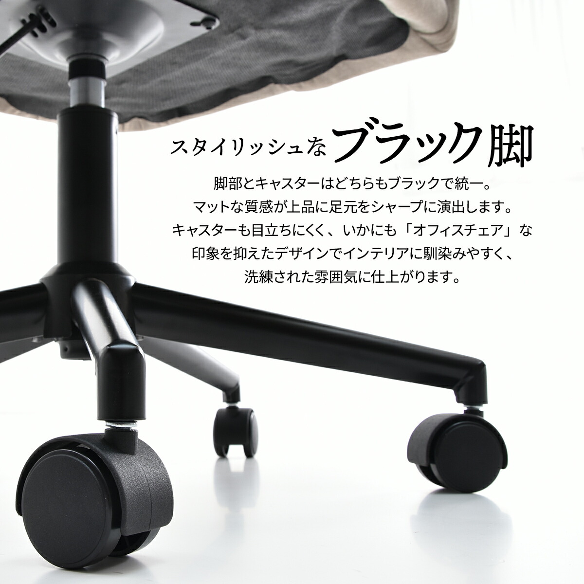 脚部とキャスターはどちらも真っ黒で統一。マットな質感が上品さを引き立て、足元をシャープに演出します。