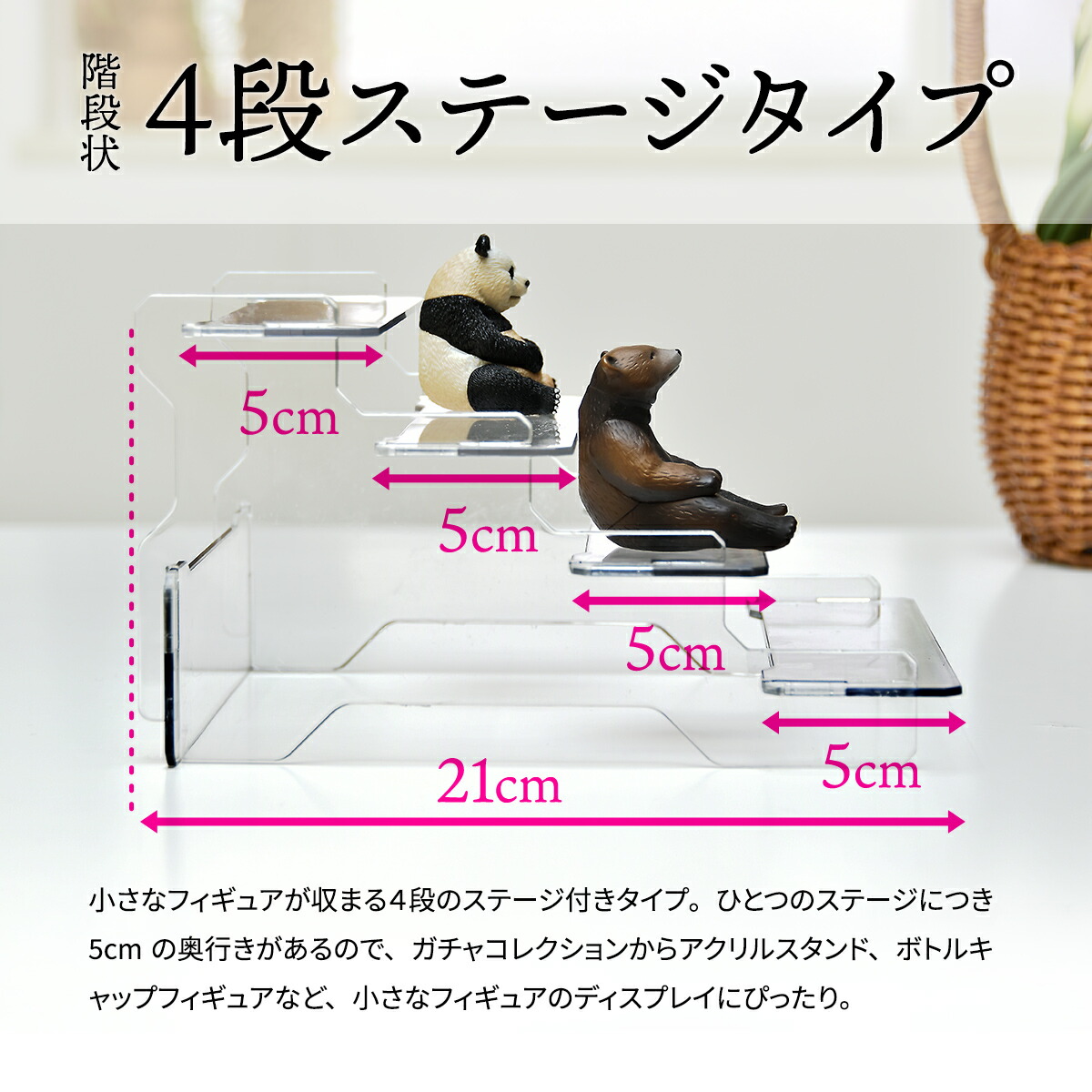 一つのステージにつき5cmの奥行きがあるので、ガチャコレクションからアクリルスタンド、ボトルキャップフィギュアなど、小さなフィギュアのディスプレイにぴったり。