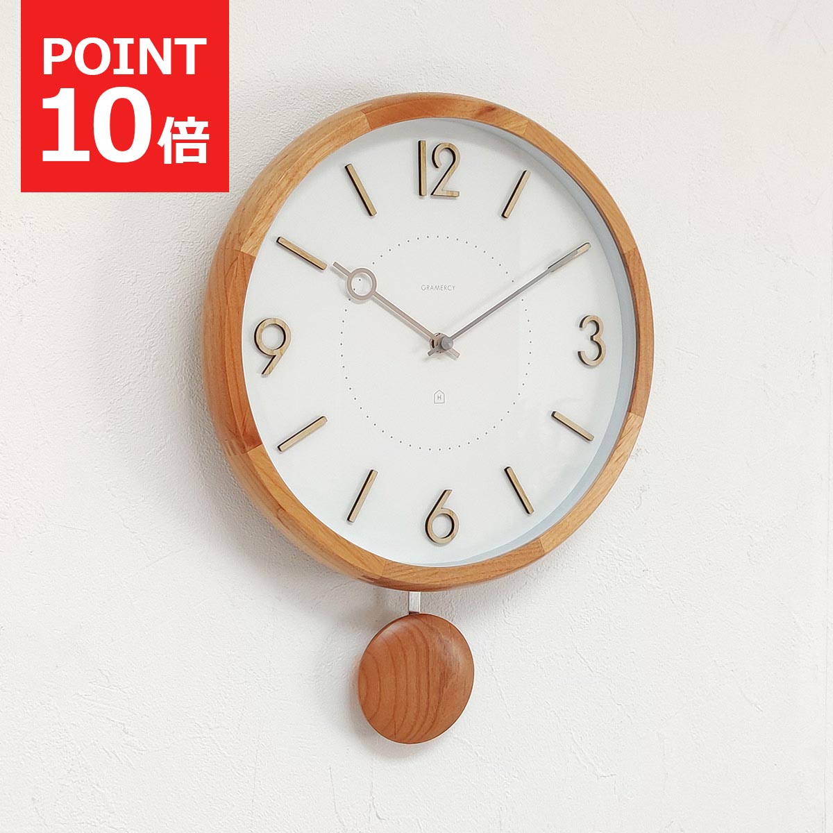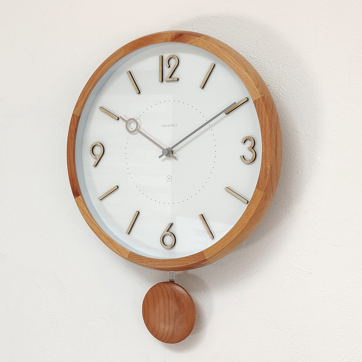 木をふんだんに使った優しい印象の振り子時計。ウッドフレームは側面に丸みを付けて滑らかな手触りに仕上げています。