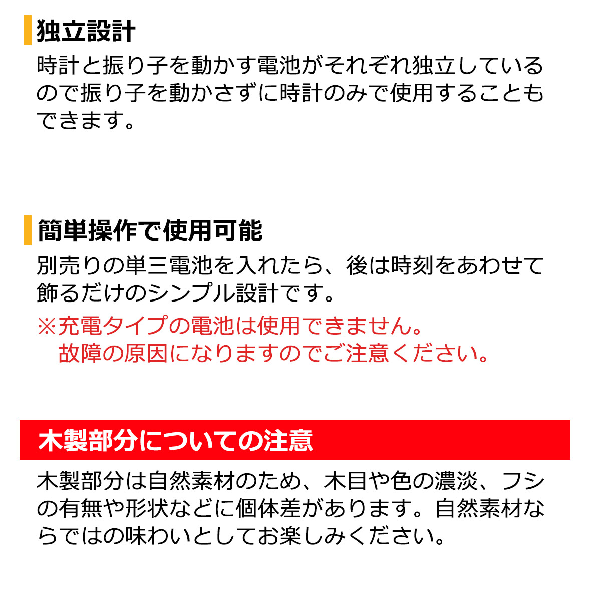 時計と振り子を動かす電池がそれぞれ独立しているので振り子を動かさずに時計のみで使用することもできます。