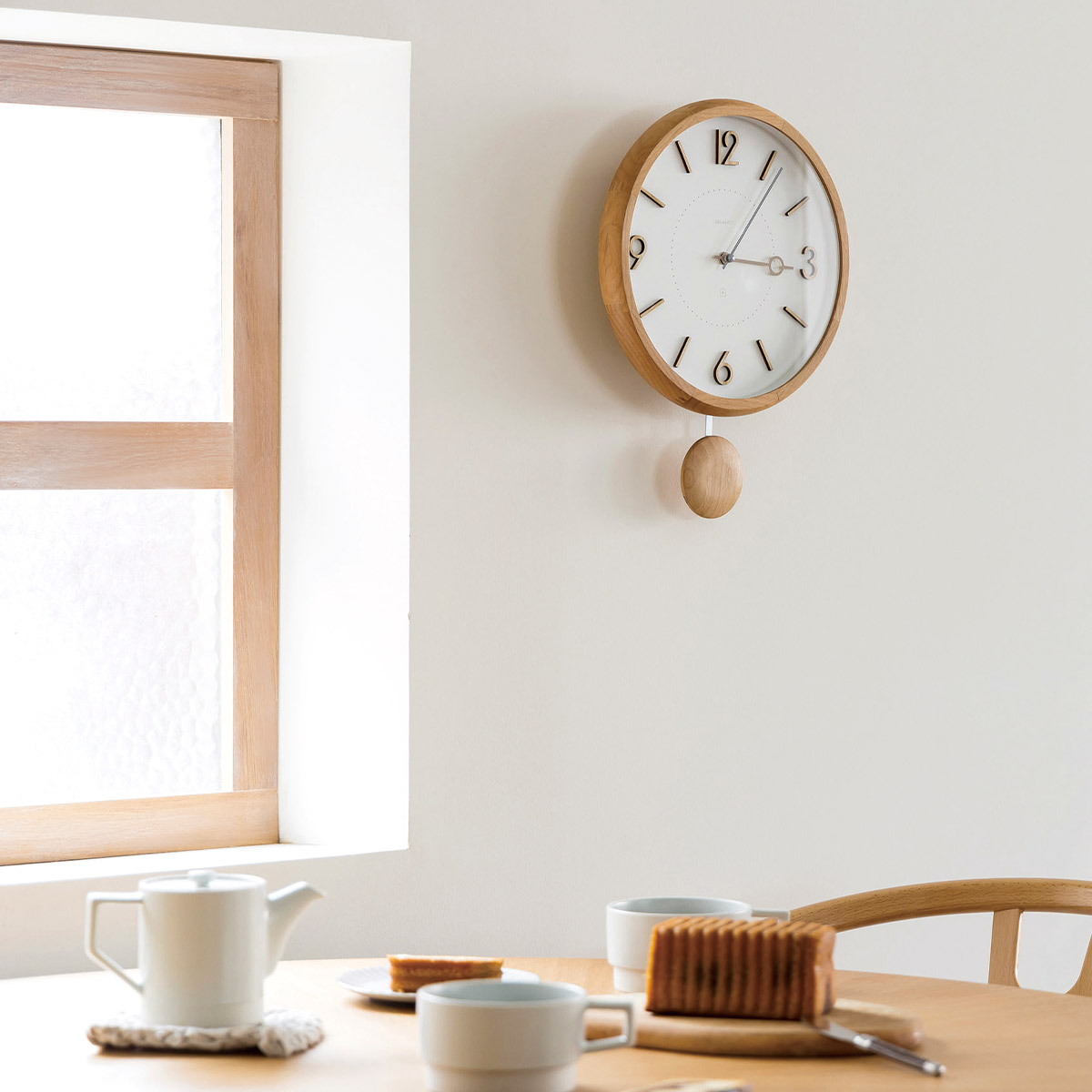 木をふんだんに使った優しい印象の振り子時計。ウッドフレームは側面に丸みを付けて滑らかな手触りに仕上げています。それに呼応するように振り子もふっくらとした立体感をもたせました。文字盤の数字にも木製パーツを使用、立体的に見えるデザインで表面には木目も見られます。針は時計の優しい雰囲気を邪魔しないようにブラックではなく、グレーとベージュで穏やかな印象に。壁に取り付けると少し時計が浮いているような奥行のあるデザインになり、見る角度によって違った表情を見せてくれます。時計と振り子を動かす電池がそれぞれ独立しているので振り子を動かさずに時計のみで使用することもできます。