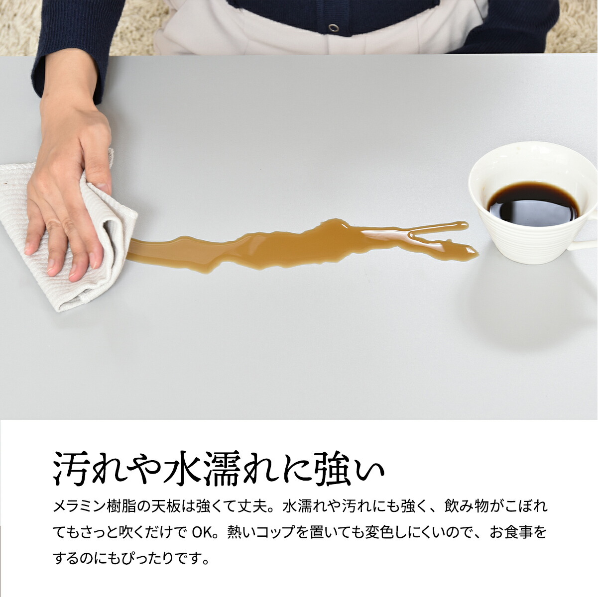 メラミン樹脂の天板は強くて丈夫。水濡れや汚れにも強く、飲み物がこぼれてもさっと拭くだけでOK。