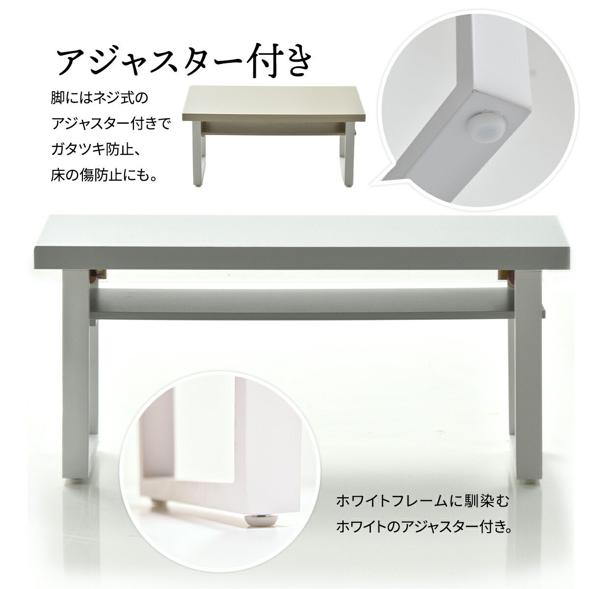 脚にはネジ式のアジャスター付きでガタツキ防止、床の傷も防止します。