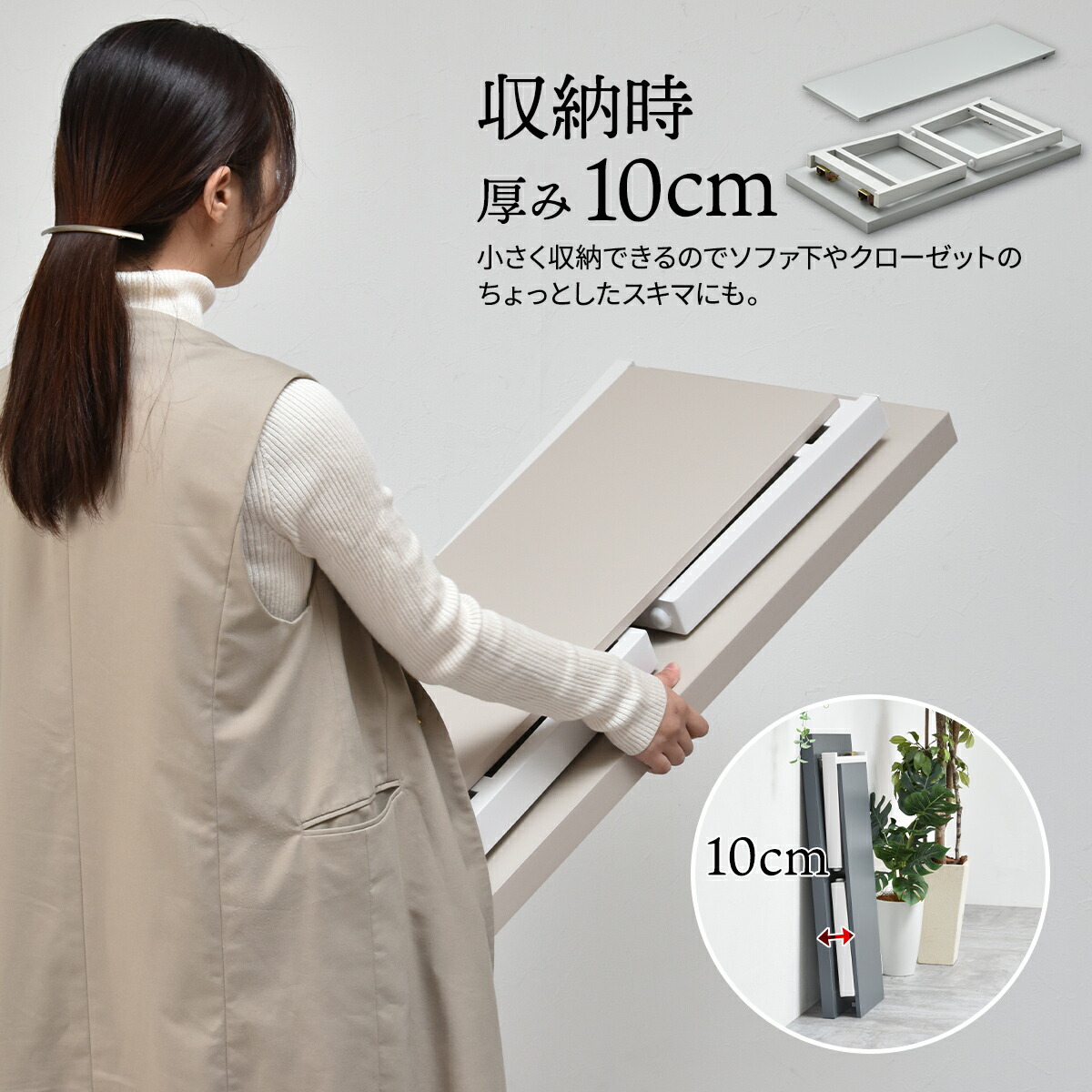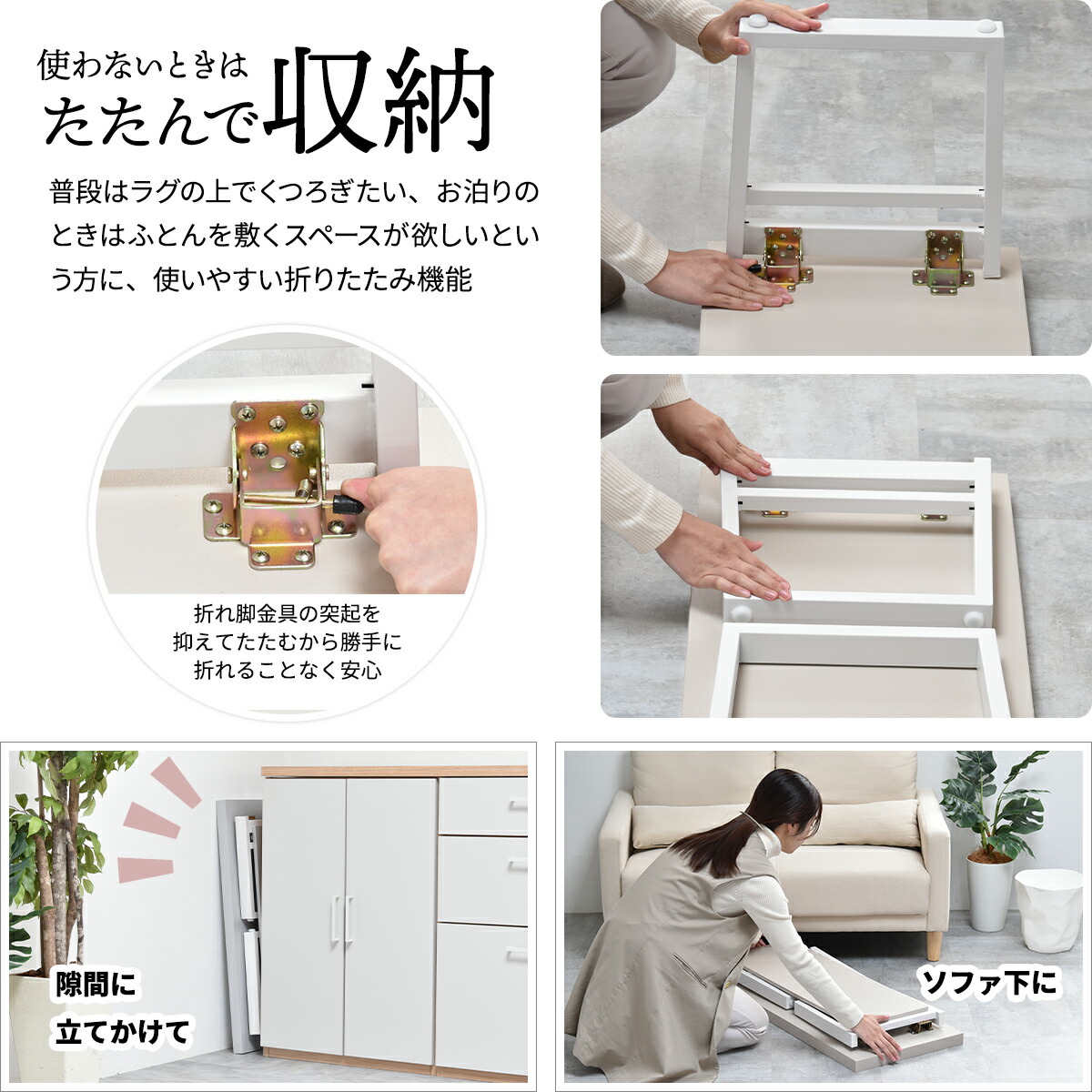 使いやすい折りたたみテーブル 収納幅7cmだから、ベッドやソファの下にも収納可能。