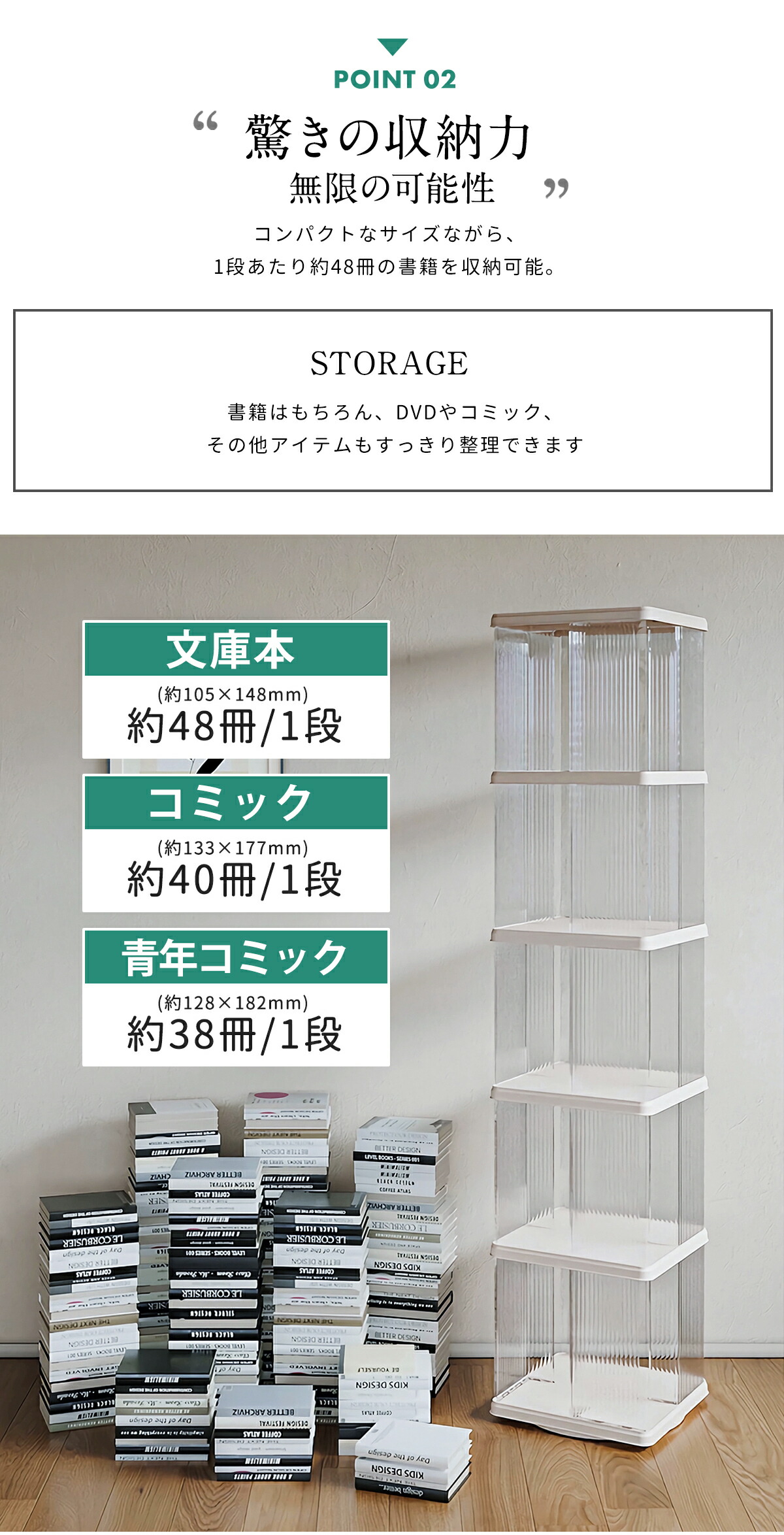 1段あたり約48冊の収納力、各段約9kgの耐荷重で、コミック・文庫本からA4ファイルや雑誌まで幅広く対応。2段から5段まで選べるので、お部屋のスペースに合わせて最適なサイズをお選びいただけます。