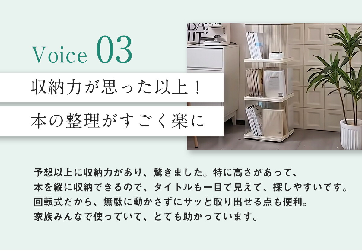 ベアリング搭載で360度スムーズに回転。本棚の奥の本も軽く回すだけで取り出せます。四面すべてから出し入れできるので、使い勝手も抜群です。
