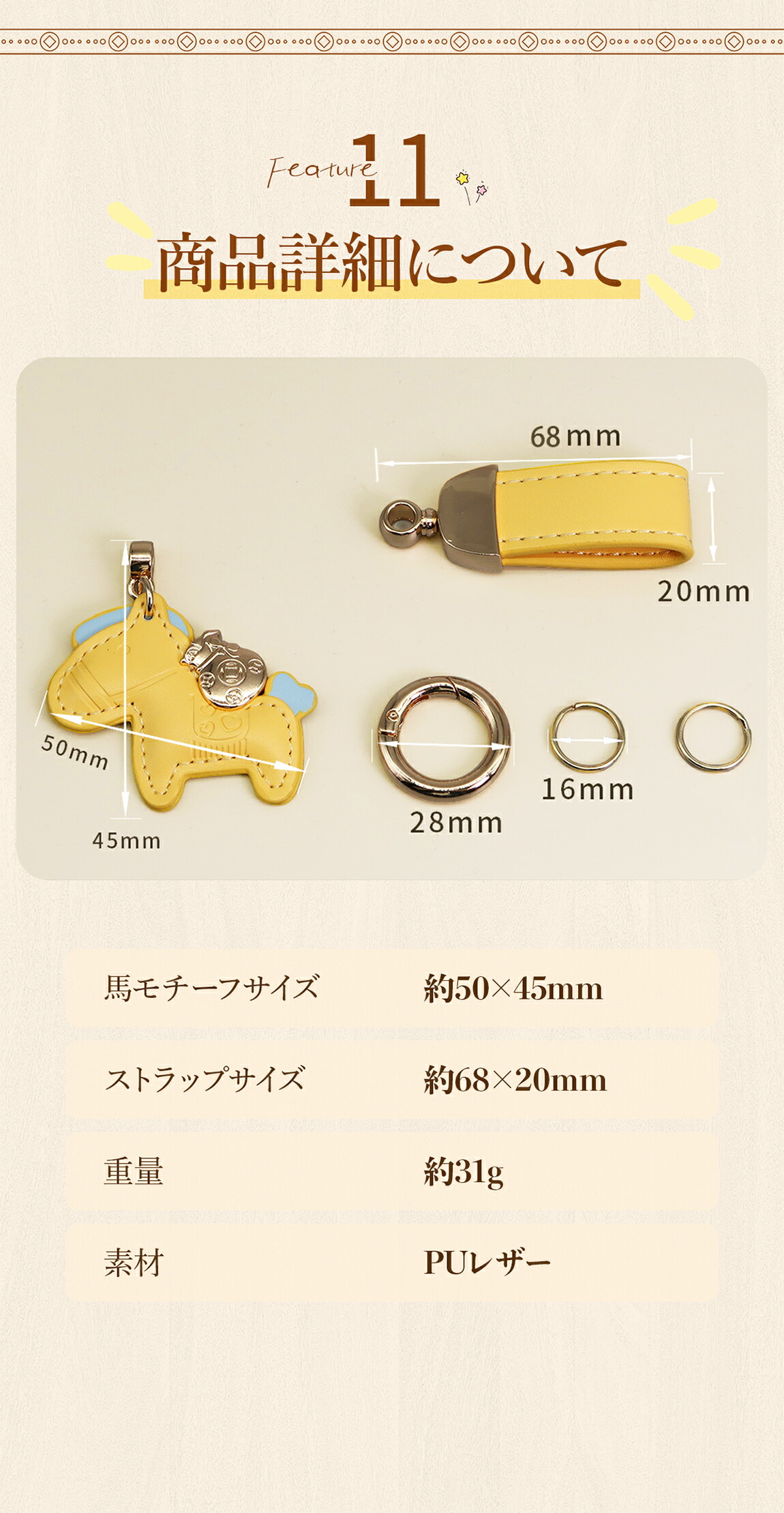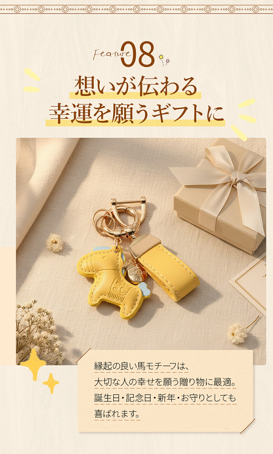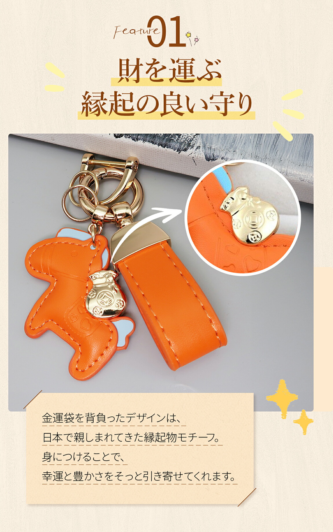 「馬(うま)」にちなんだ縁起の良いモチーフを取り入れた、毎日持ち歩ける開運キーホルダーです。