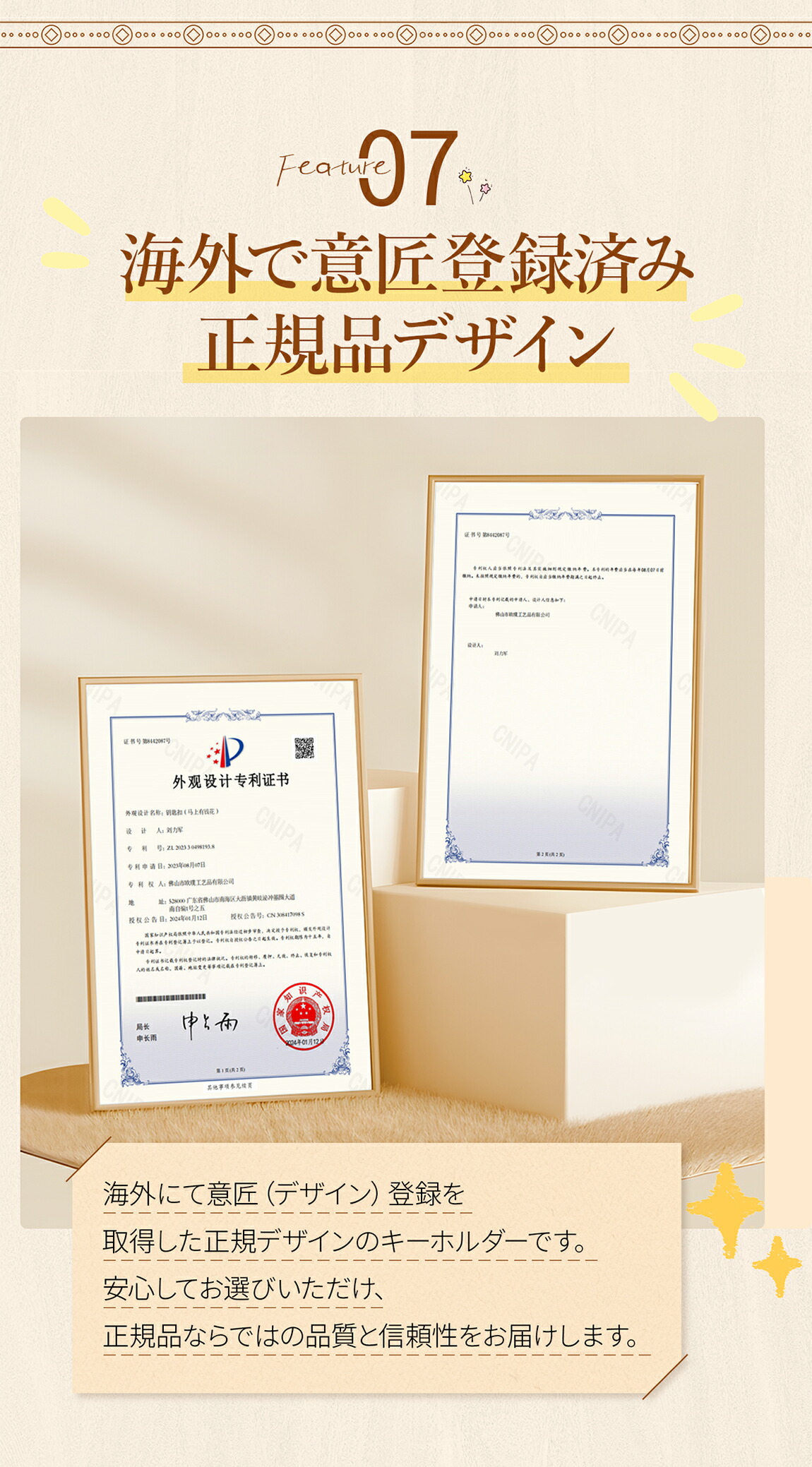 キーリングやフック、ネジ部分まで光沢感のあるゴールドカラーで統一。全体にまとまりのある上品な印象を与えます。