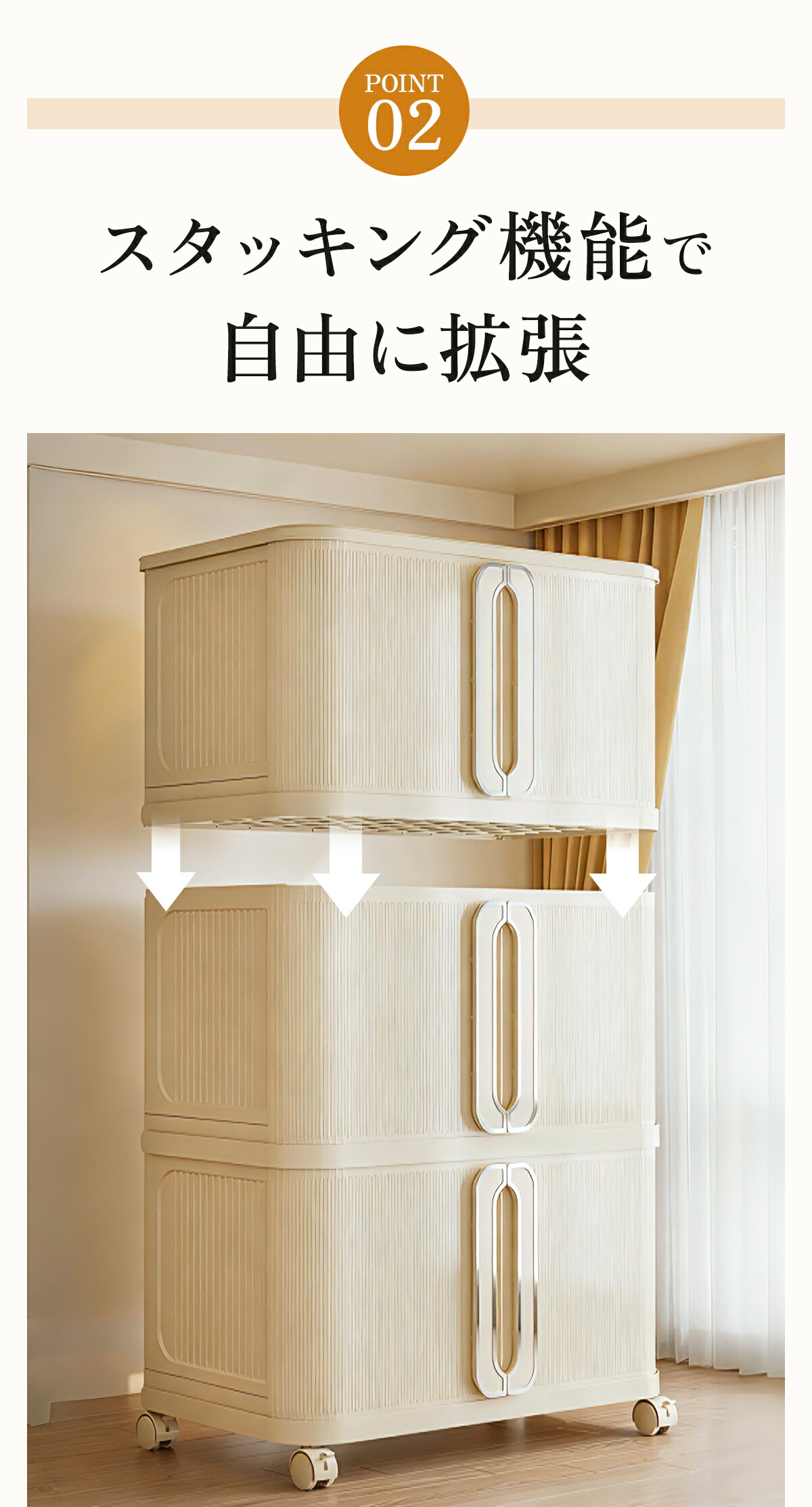 積み重ねロック付きで、高く積んでも倒れにくい安心設計。お部屋のスペースや収納したい量に合わせて、自由に段数を積み上げてカスタマイズできます。