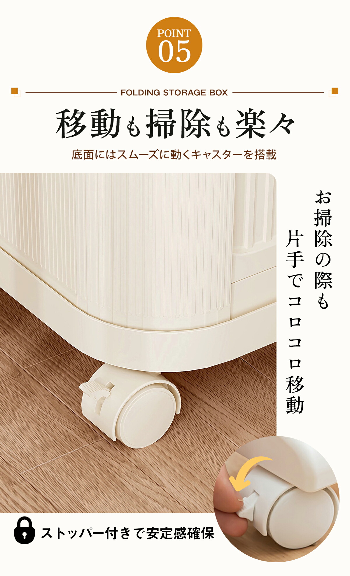 底面にはスムーズに動くキャスターを搭載。重たい飲料や衣類を収納しても、片手でコロコロ移動でき、お掃除の際も邪魔になりません。