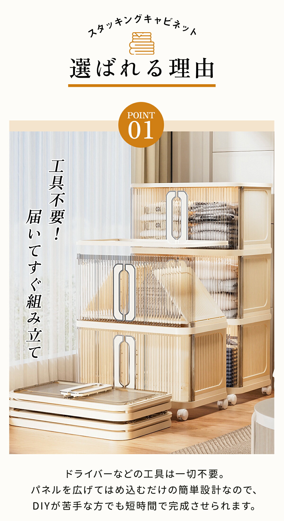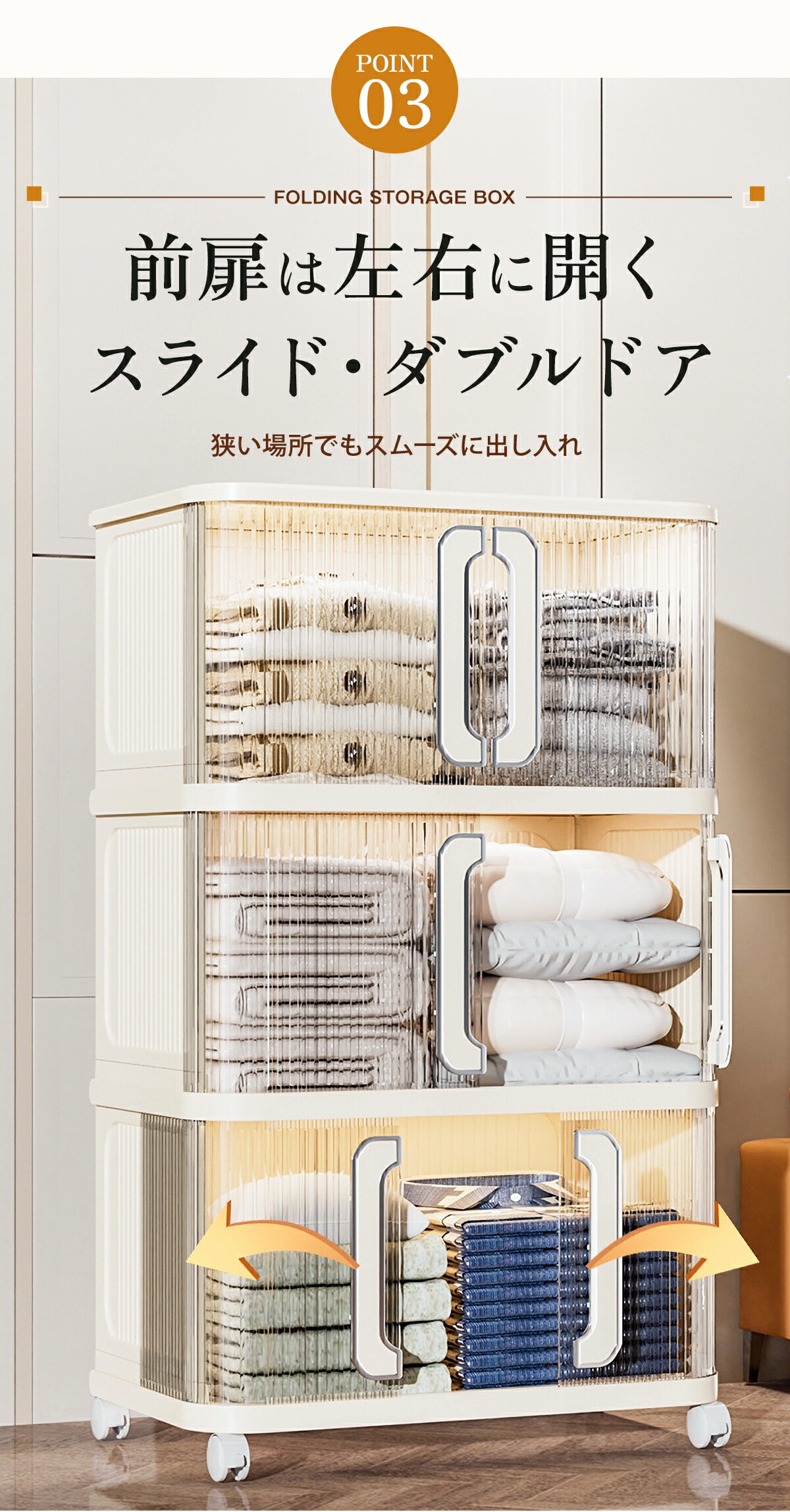 収納ボックス キャスター付き 前開き フタ付き おしゃれ 折りたたみ 大容量 コンテナ スタッキング キャビネット 衣装ケース 衣類収納 おもちゃ箱 蓋付き 透明 ホワイト 扉付き 横開き クリア