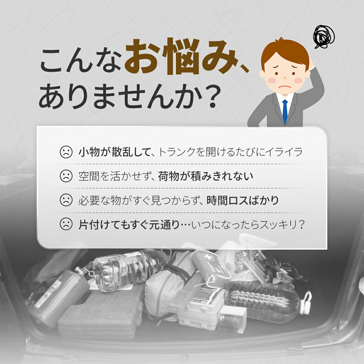 小物や荷物が散乱しがちなトランク内をまとめて整理。開けるたびに感じるイライラを解消し、いつでもスッキリ整った空間に。