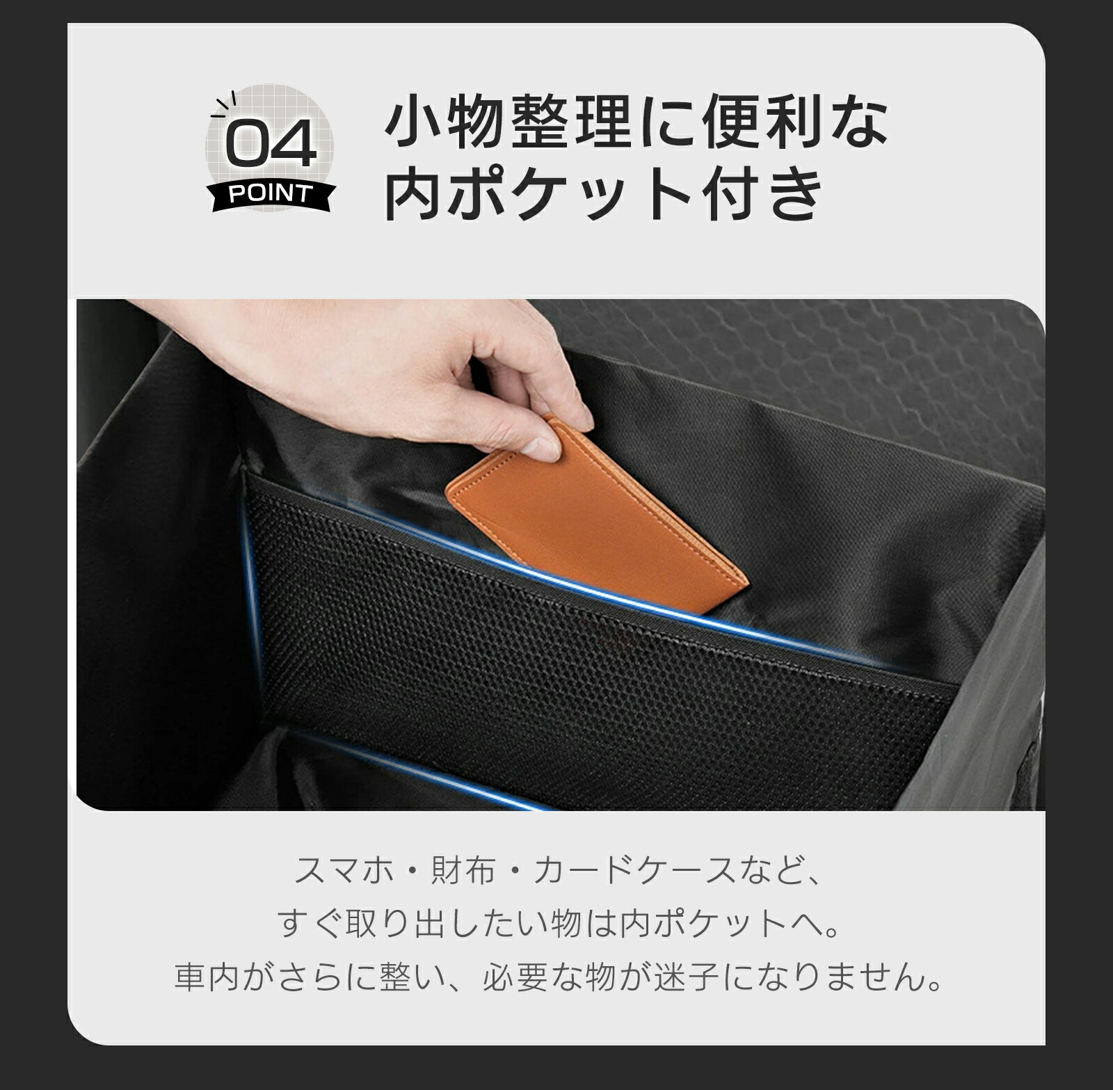 約33×31×41cmの30L大容量設計、車内をすっきり整理できます。内側ポケット付きで、小物の出し入れもラクラク。