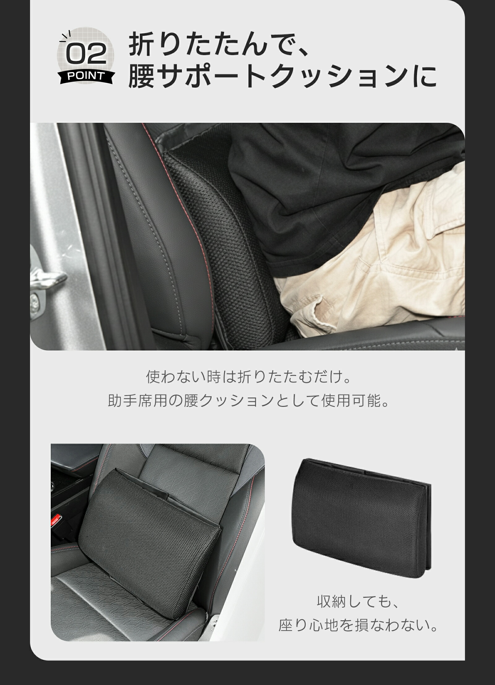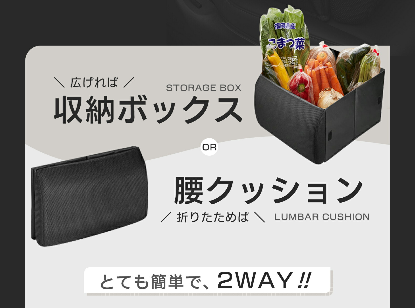 折りたたむと腰当てクッション、広げると収納ボックスに。1つで2役をこなす便利なカーアイテムです。