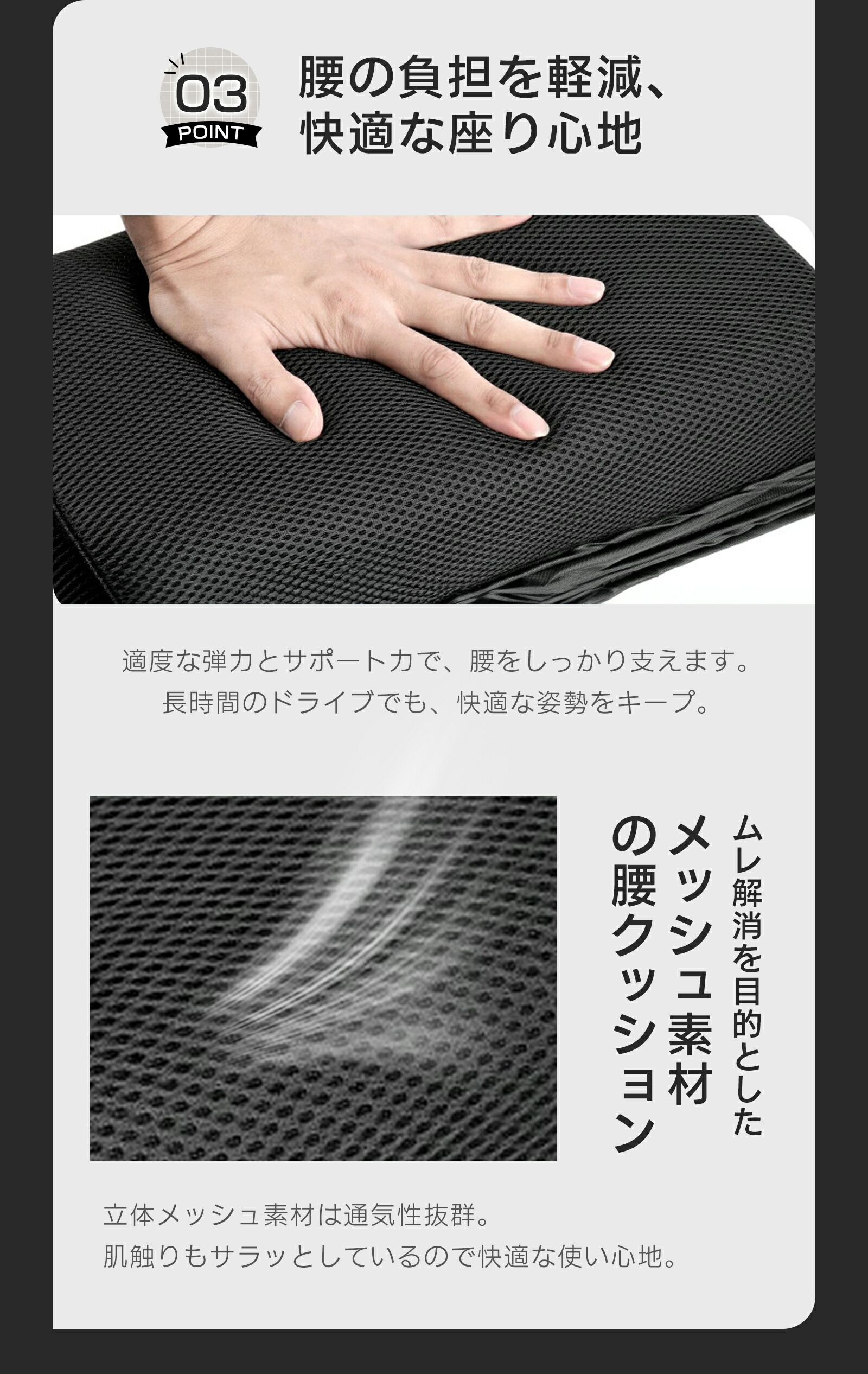 背中とシートの隙間をしっかり支え、長時間運転の疲れをやさしく軽減します。
