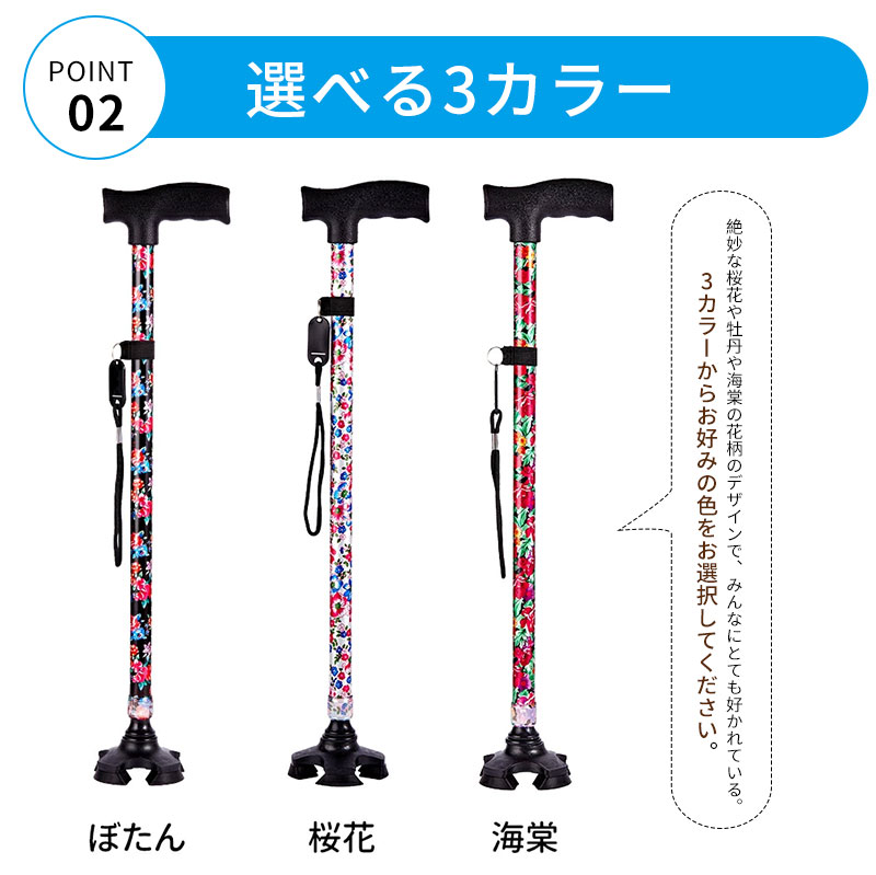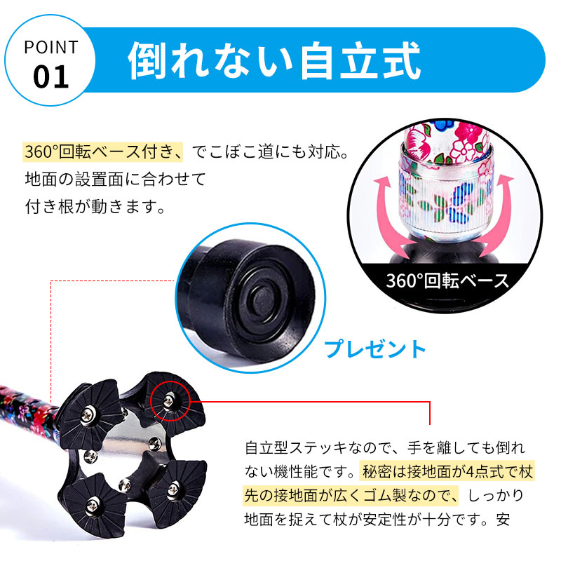 杖 おしゃれ 自立式 四点杖 4点杖 海棠 桜花 ぼたん 桔梗 紫鳶 多花 黄葉 青葉 ブラック ワインレッド