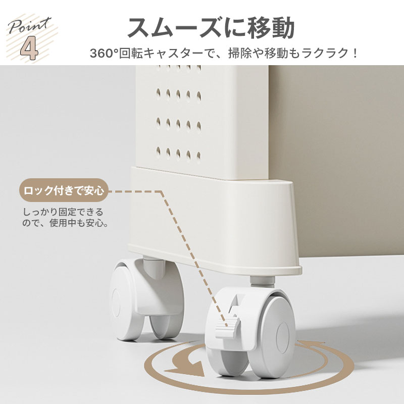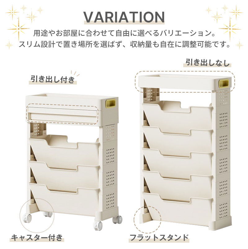 スリム設計で雑誌や小物をたっぷり収納可能。サイドは穴ボード仕様で有効活用できます。トップトレイ引き出し収納キャスター付きで使い勝手抜群。省スペースで移動もラクラク、自由に段数を調整できる多機能収納ラックです。