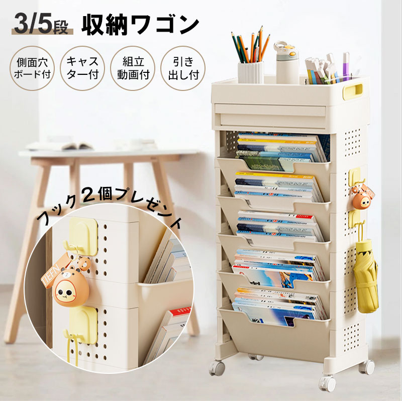 マガジンラック 収納ワゴン キャスター付き 5段 3段 デスク下本棚 多機能収納 ラック 引き出し付 側面穴ボード付 移動式収納 文房具収納 子供部屋 オフィス用 本立 ファイル立て 雑誌収 両面収納