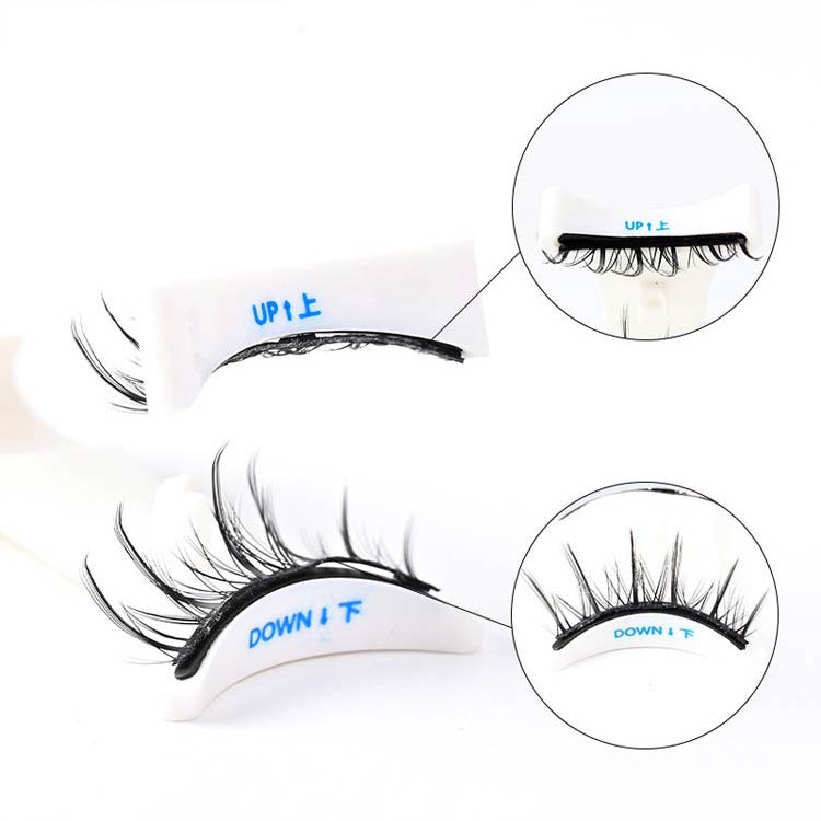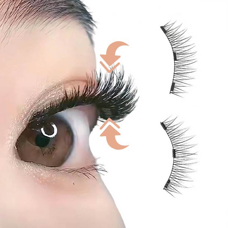 【装着方法】1. 自まつげをビューラーでカールさせます。その後、マスカラ下地やブラシでとかすことをおすすめします。2. ケースから左右いずれかのまつげを取り出し、指でつまんで二つに分けます。3. マグネット部分に青い印があるほうを「UP↑上」側に装着します。カールを上にしたとき、右側に印があるものが右目用、左側に印があるものが左目用です。4. マグネット部分に白い印があるほうを「DOWN↓下」側に装着します。カールを上にしたとき、右側に印があるものが右目用、左側に印があるものが左目用です。5. 鏡を下側に置き、視線より低い位置にセットして、顎を少し上げて目元を確認しやすくします。6. 「UP↑上」側を上にした状態で、まつげの根元に押し当てます。※根元から0.5mm-1mm程度離してください。7. 軽く挟んで離したら装着完了です。同じ要領で両目に装着します。最初は難しいかもしれませんが、慎重に行えば簡単に付けられるようになります。8. お好みでアイラインを加えると、より自然な印象に仕上がります。