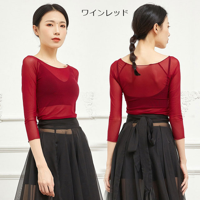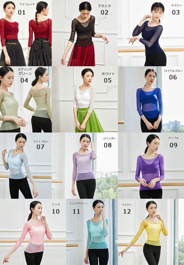 バレエ トップス 7分袖 メッシュ シ 01-ワインレッド 02-ブラック 03-ネイビー 04-スプリンググリーン 05-ホワイト 06-ロイヤルブルー 07-ライトブルー 08-ラベンダー S M L XL XXL XXXL