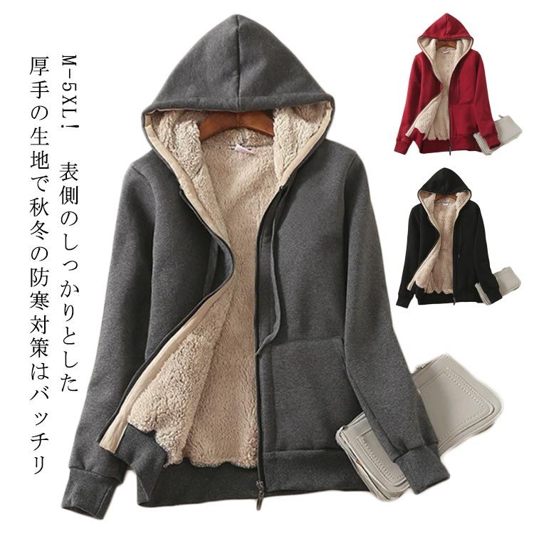裏ボア ポケット付き 長袖 M-5XL スウェット ジップパーカー フード付き ジップアップ フリース アウター パーカー 防寒着 スポーツ 裏起毛 レディース 冬 大きいサイズ