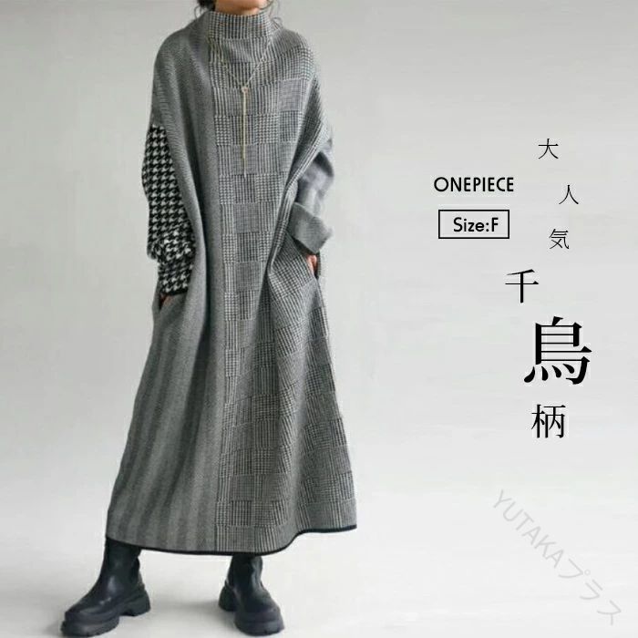 ニット ワンピース レディース 秋冬 ハイネック 千鳥柄 マキシ丈 ライン きれいめ おしゃれ 上品 着痩せ 暖かい 冬物 フォーマル デート パーティー 用