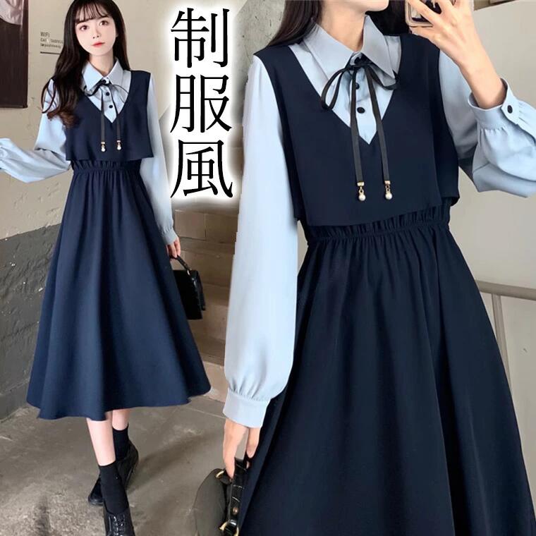 胸リボン リボン 重ね着に見える レイヤード セット 制服風ハイウエストワンピース フェイクツーピース 清楚イメージ ベス 一式