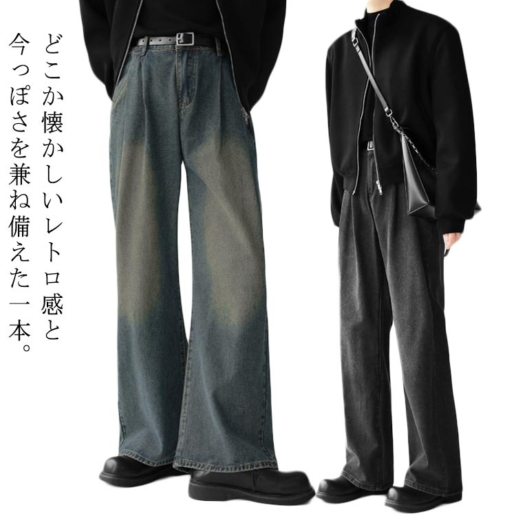 ワイドパンツ ブーツカット メンズ レディース カジュアル タック入り ジーンズ デニム レトロ ウォッシュ加工 ユニセックス おしゃれ 韓国ファッション 映える ボトムス ストレート