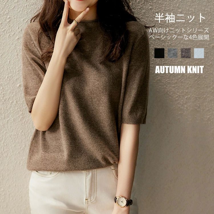 ニットトップス プチハイネック トップス ゆったり Tシャツ レディース 体型カバー 5分袖 カットソー ニット 二の腕カバー 半袖