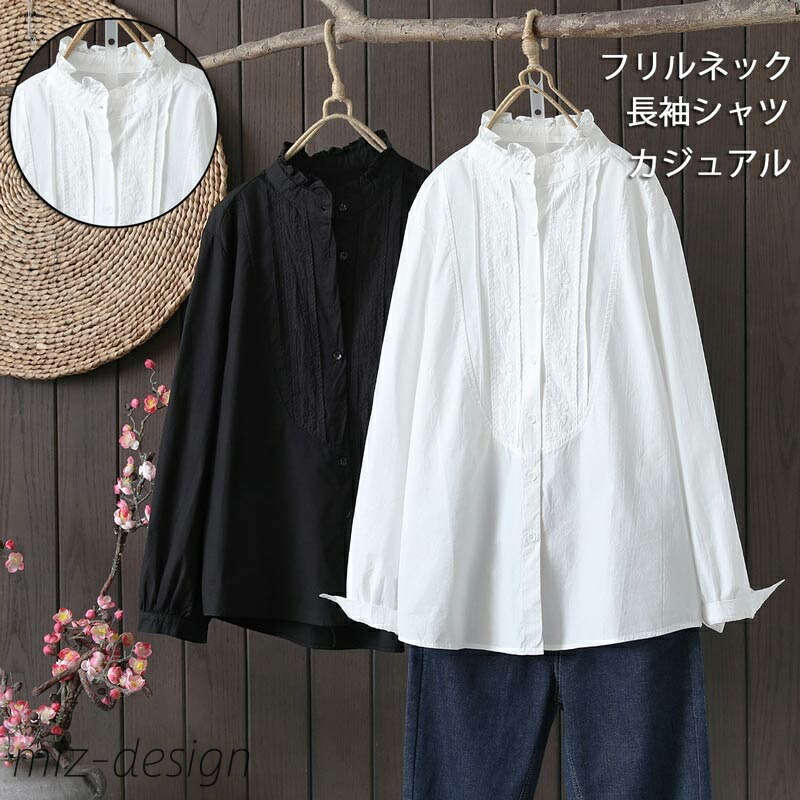 レディース フリル フリルブラウス シャツ タック 長袖ブラウス 長袖 フリルネック ブラウス 無地 シャツブラウス 綿 コットン ドッキング