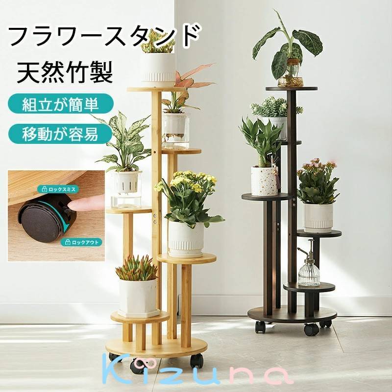 フラワースタンド 花台 プランタースタンド 5階 園芸ラック キャスター付き 観葉 植物 天然竹製 植木鉢台 安定させる 北欧 バルコニー 組み立てが簡単 移動が容易 指向性キャ ガーデンラック