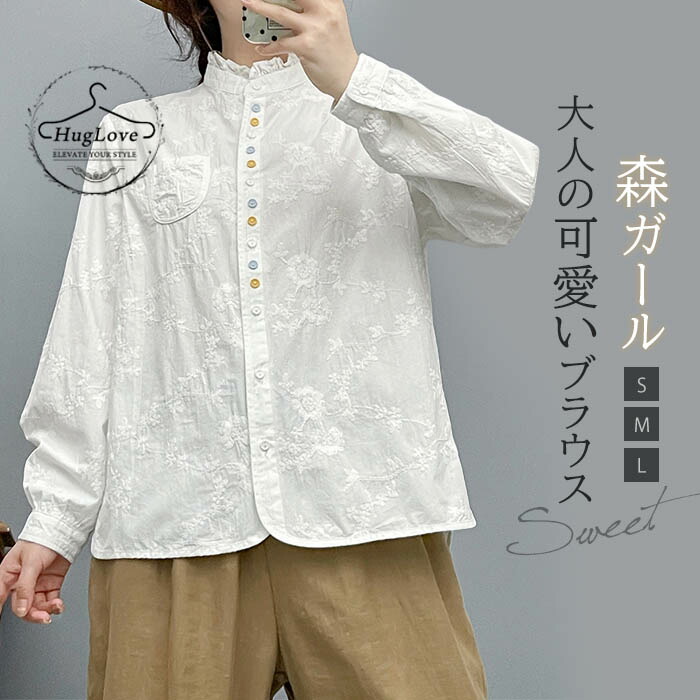 シャツ レディース 秋 長袖 綿シャツ シャツブラウス フリル襟 サイドスリット トップス 前開き 綿 刺繍 花柄 大人可愛い 大きいサイズ ゆったり ナチュラル カジュアル モード エレガ シンプル