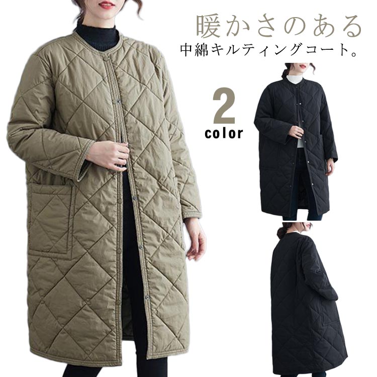 ノーカラー キルト 中綿 ノーカラーコート 秋 膝下丈 中綿コート おしゃれ キルティング ロングコート クルーネック