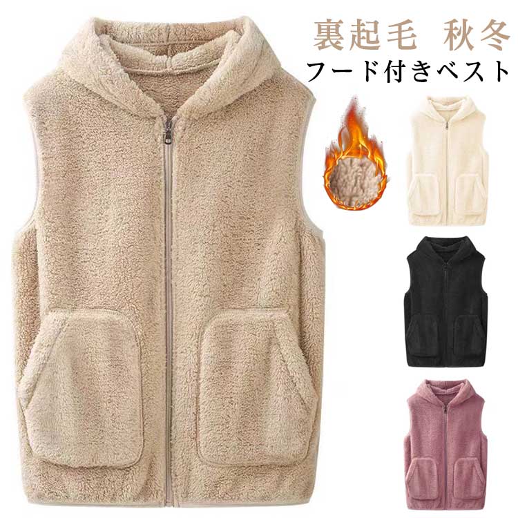 シンプ 無地 あったか 重ね着 フリースベスト 防寒着 暖かい もこもこ ブルゾン ベスト 秋冬 レディース ボアベスト フード付き