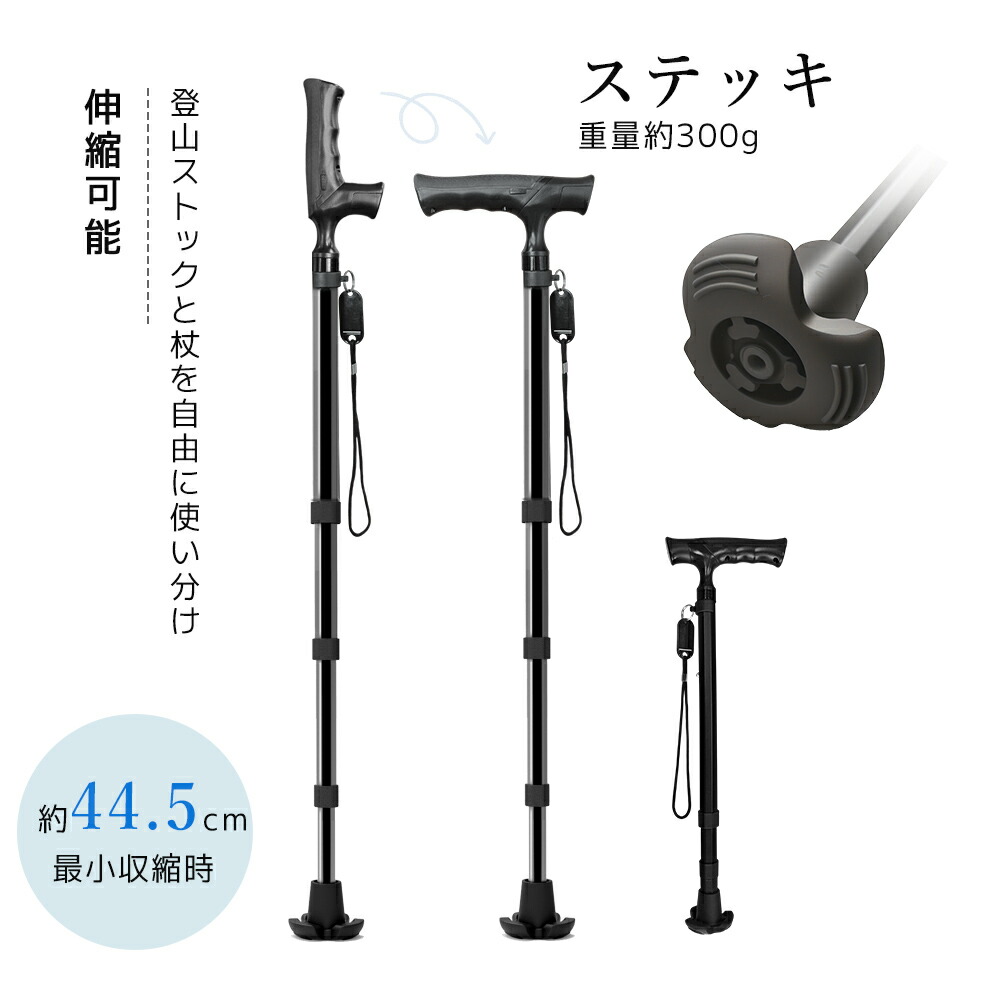 ステッキ 杖 軽量 つえ 3点杖 自立式 伸縮可能 滑り止め 歩行補助 男性 女性 綺麗 介護 高低調整可能 6段階調整 高齢 母の日 登山ストックと杖を使い分け コンパクト