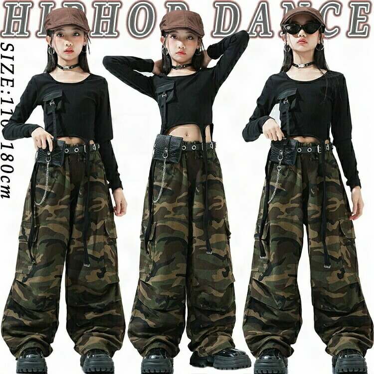 ダンス衣装 上下セット カーゴパンツ 長袖トップス ヒップホップ チア キッズ用 子供服 迷彩柄 カーキグリーン 黒色 K-POP ジャズダンス 演出用 へそ出し仕様