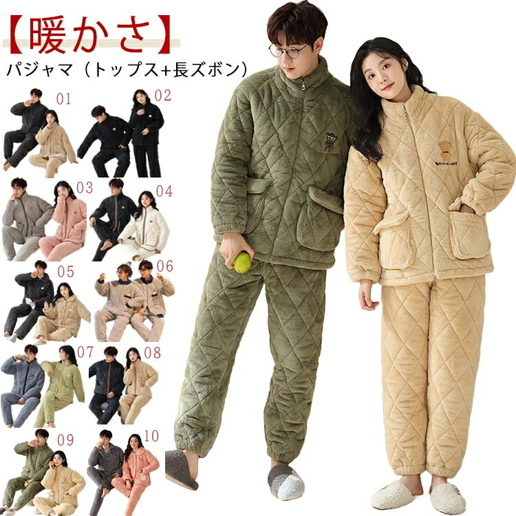可愛い ペアルック パジャマ メンズ レディース ルームウェア 男性 冬用 長袖 上下セット 前開き 暖かい 裏起毛 もこもこ あったか 部屋着 大きいサイズ 中綿 超厚手 保暖 防寒対策