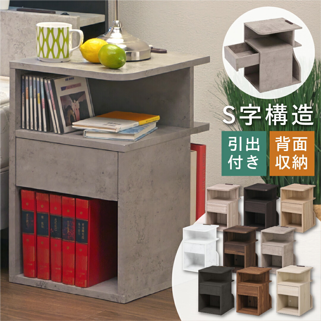 背面収納付 サイドテーブル ベッド横 完成品 おしゃれ ベッドサイドテーブル ナイトテーブル コンセント 引き出し 30cm幅 50cm高 スリム 収納 引き出し付 北欧 コンクリート 色 グ モダン