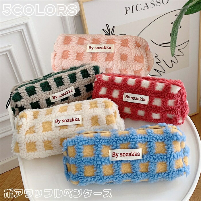 全5色 ボアワッフルペンケース 高校生女子 オシャレ 大容量 シンプル ブロック チェック柄 文具 韓国 おしゃれ 可愛い スリムポーチ 大学生 ブラシケース ボアペンケース ハ 中学生