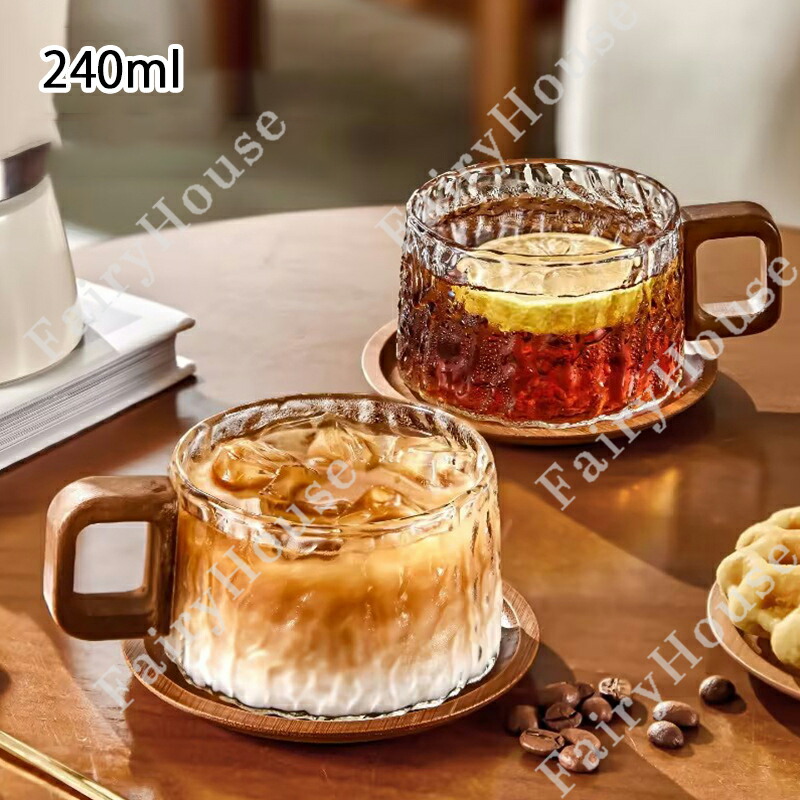 耐熱ガラスマグカップ 240ml モダン 天然木 ハンドル付き おしゃれ ティーカップ 麦茶マグコップ コーヒー グラス コップ 和風 ガラス食器 ミルク 紅茶 水 シンプル ガラス製カップ ジュース