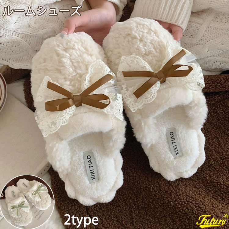 ルームシューズ レディース 滑り止め もこもこ リボン あったか スリッパ 暖かい 冬 可愛い 疲れない ふわふわ 柔らかい 来客用 かかとなし 室内 厚手 洗える ソフト おしゃれ