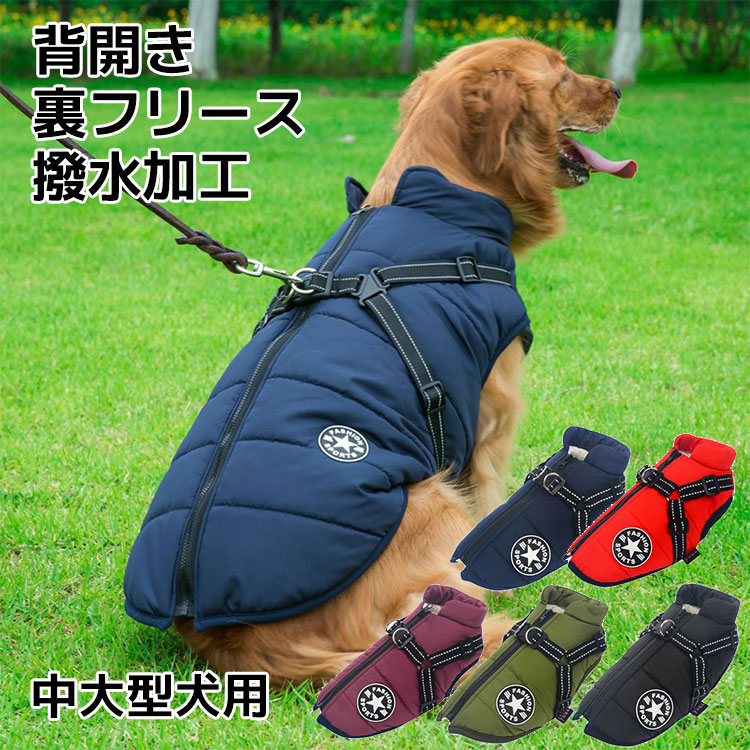 大型犬 犬服 ベスト 冬 ダウン風 ハーネス 一体型 ハーネス付き 背中開き 防寒 ドッグウェア ペットウェア 背開き ペット服 フリース 裏起毛 中型犬 かわいい 暖かい おしゃれ 散歩着 あったか
